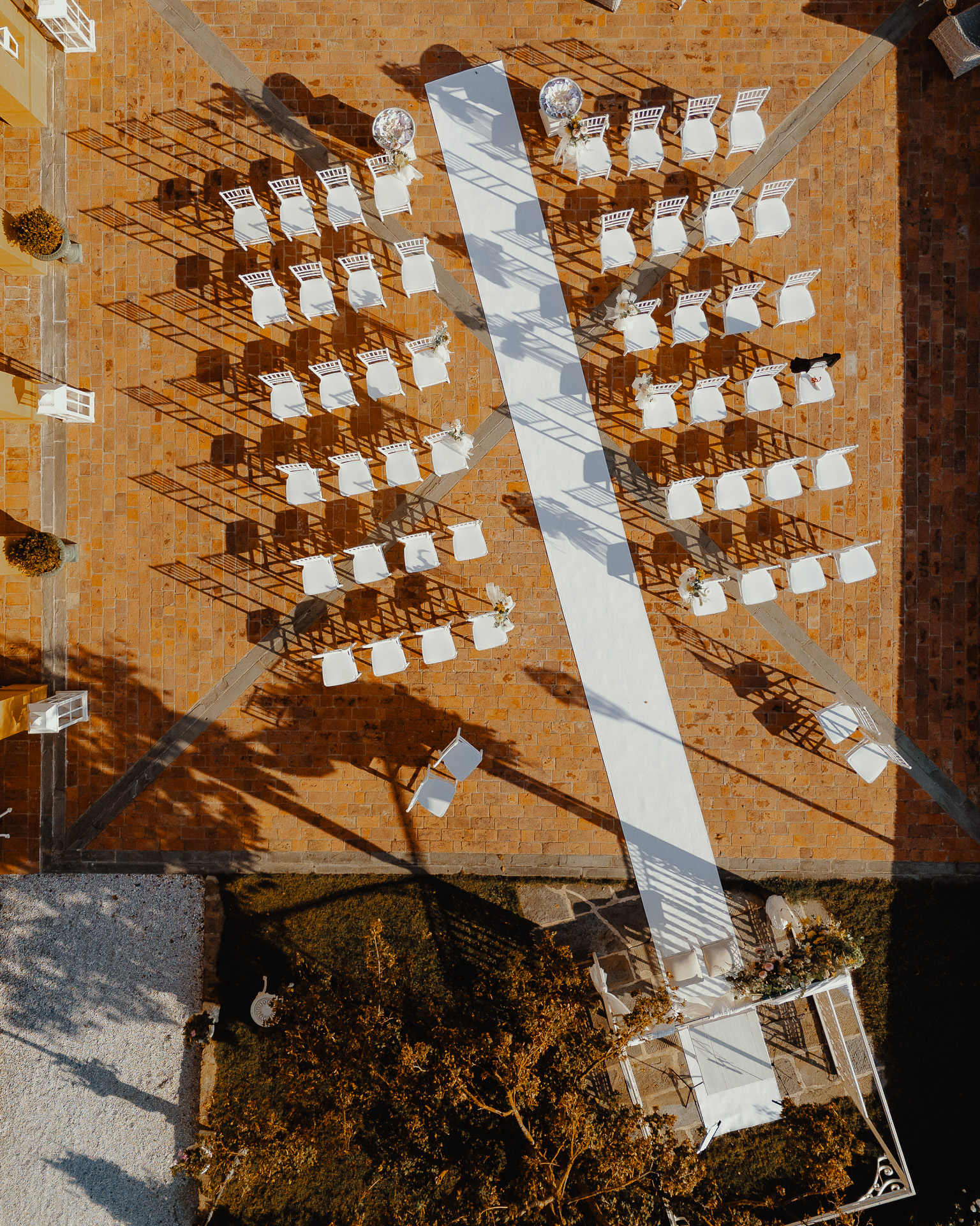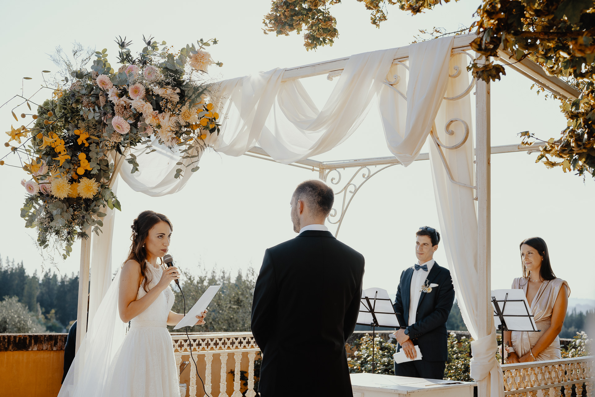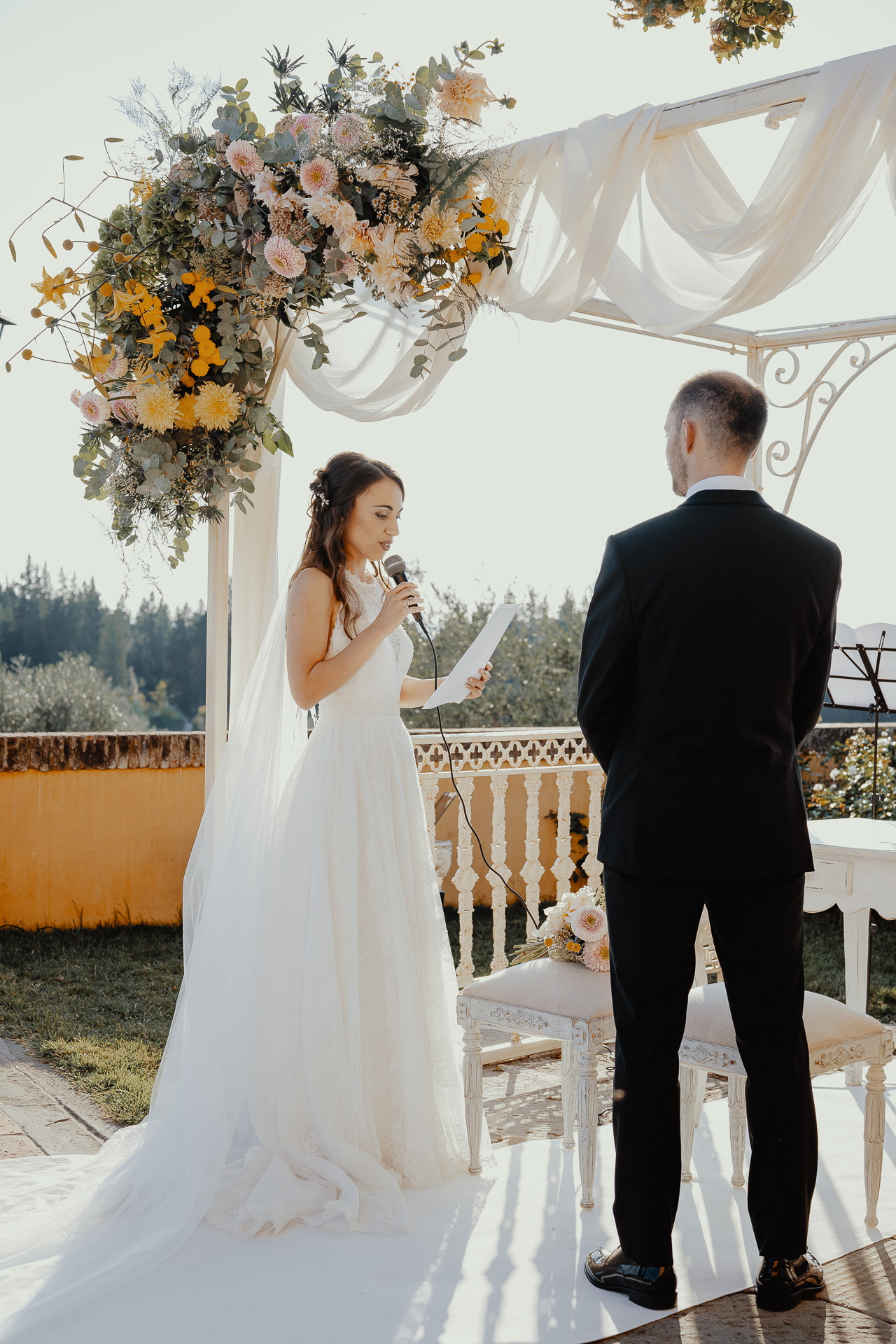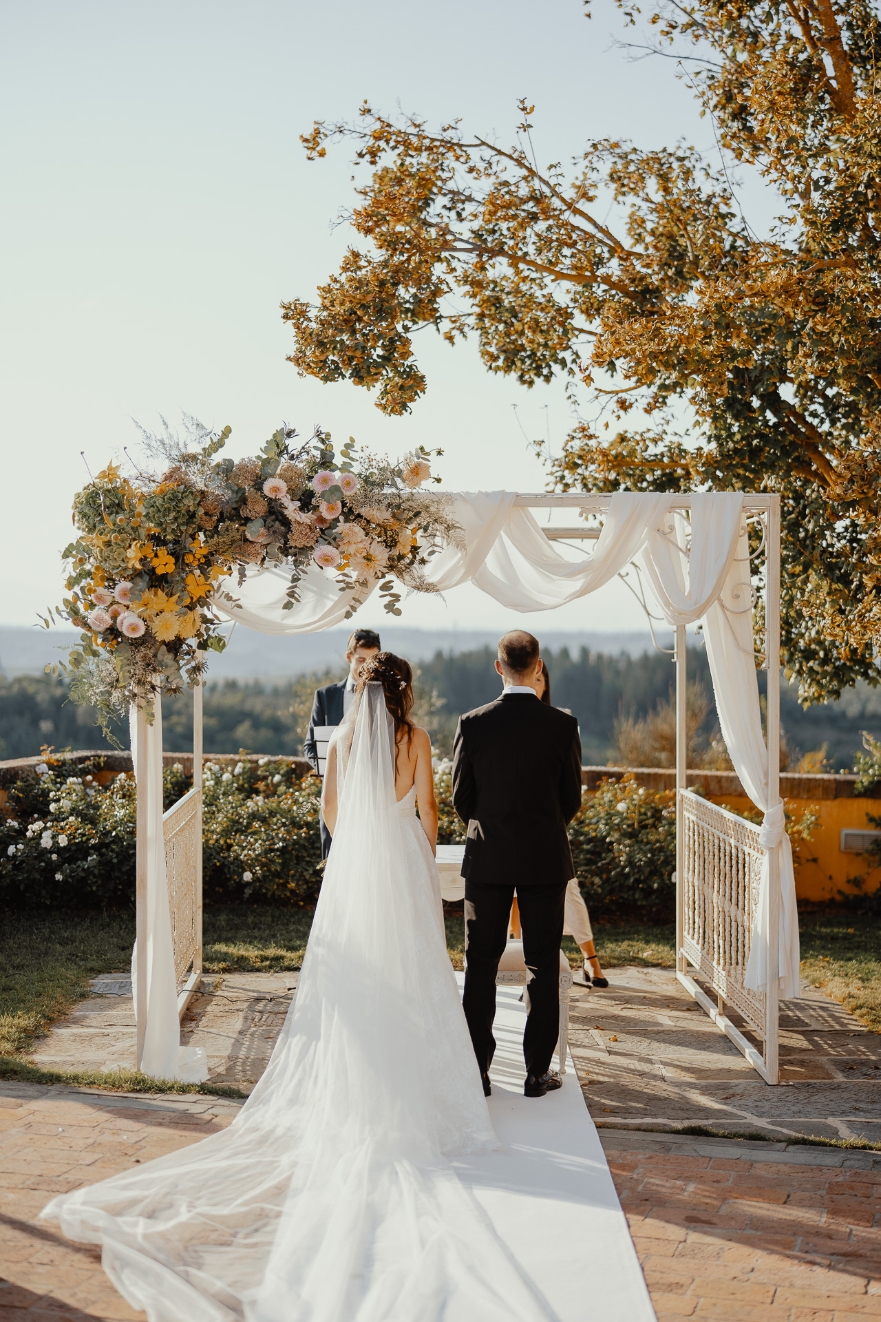 Their ceremony took place on the villa’s panoramic terrace, overlooking the rolling hills and golden fields of the Tuscan countryside — a breathtaking view that made their vows even more emotional and meaningful.