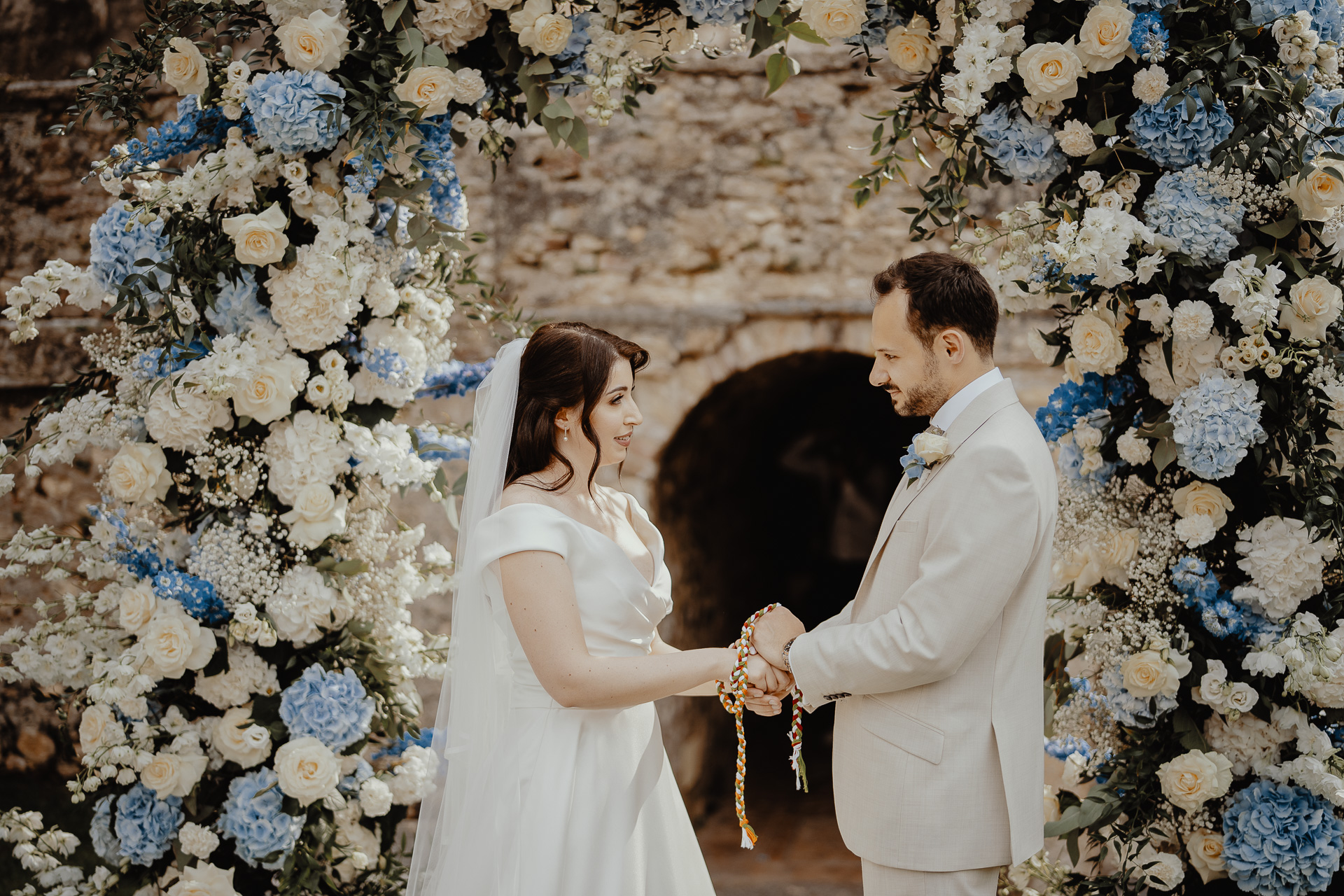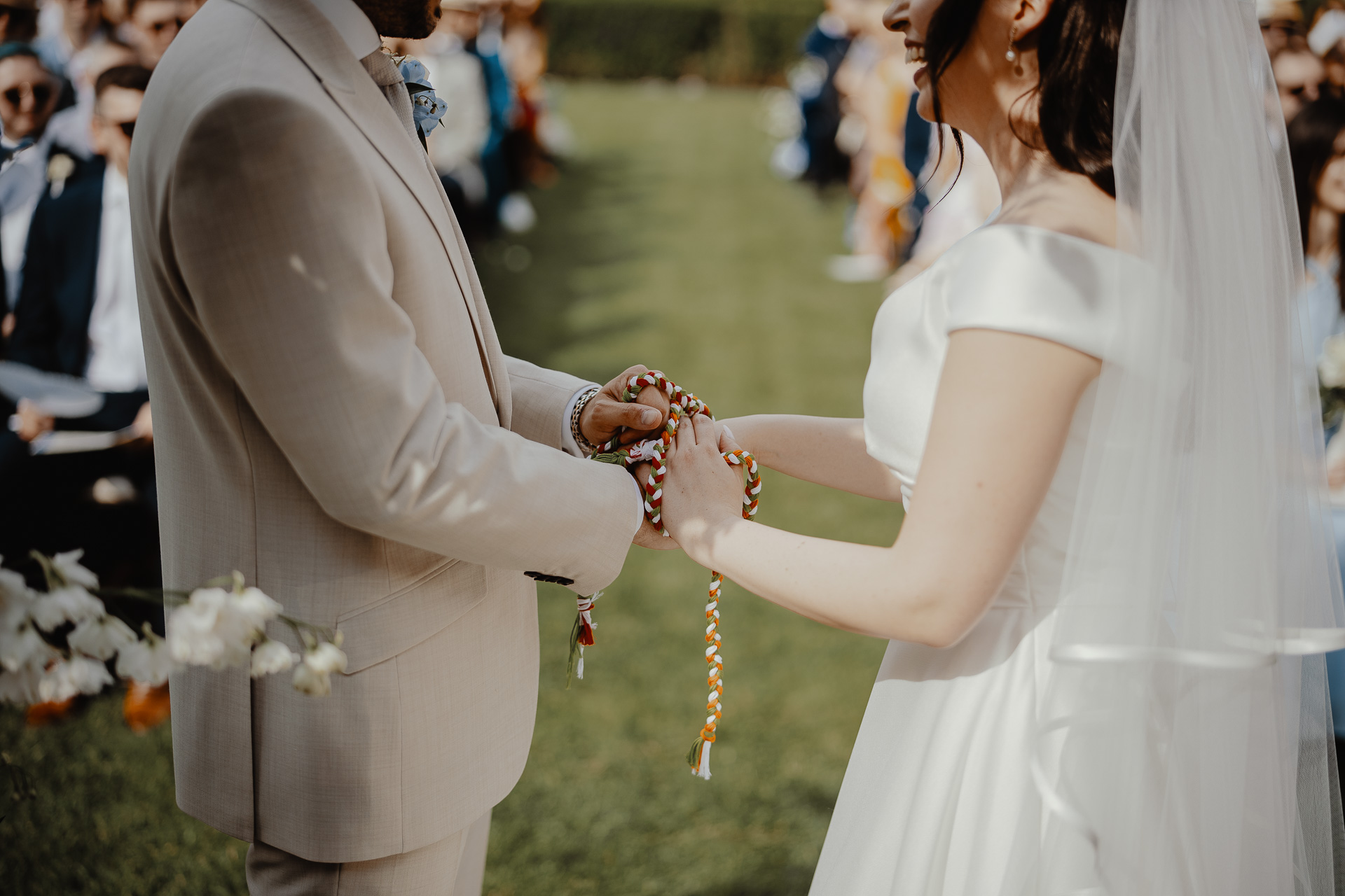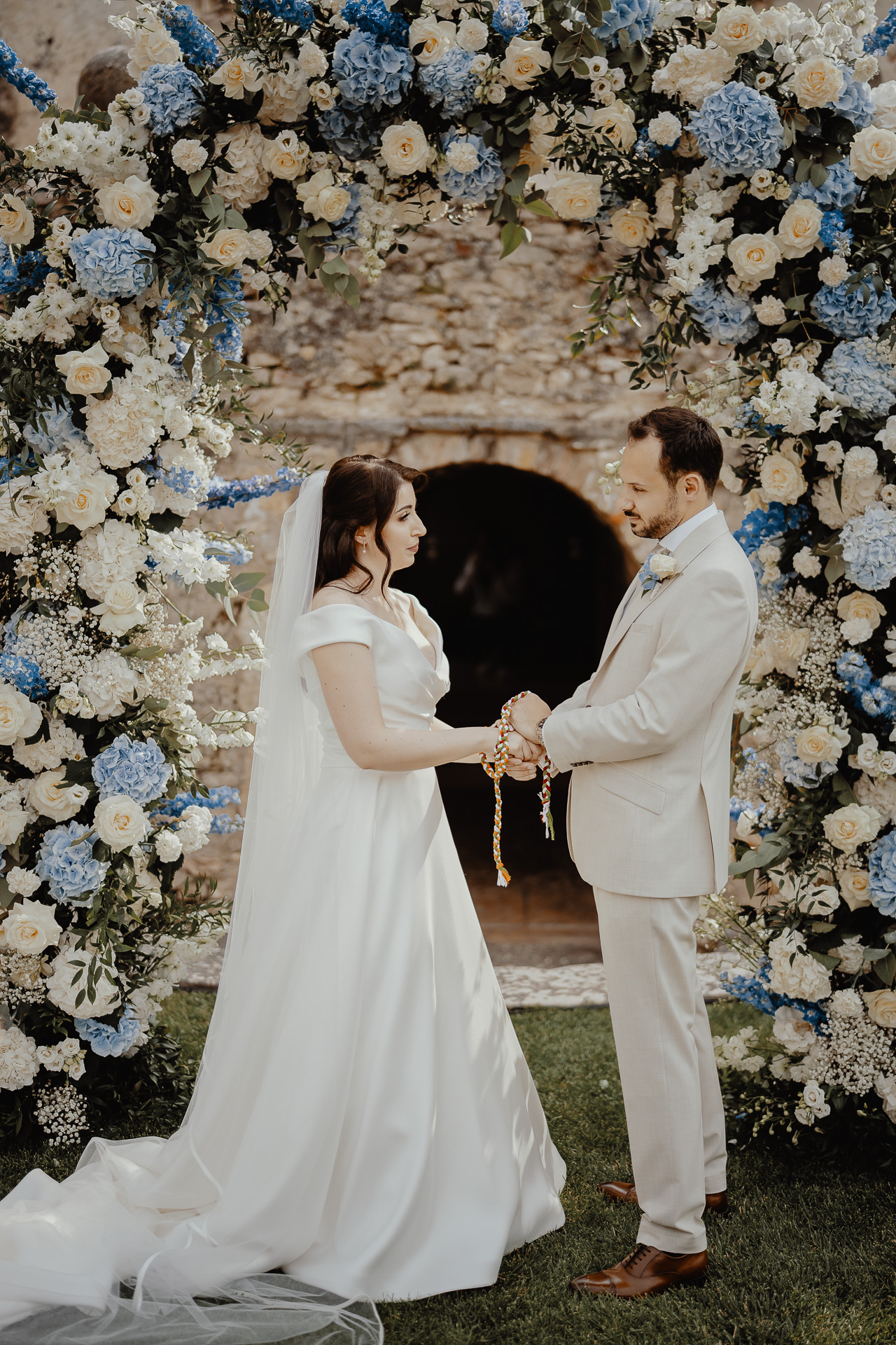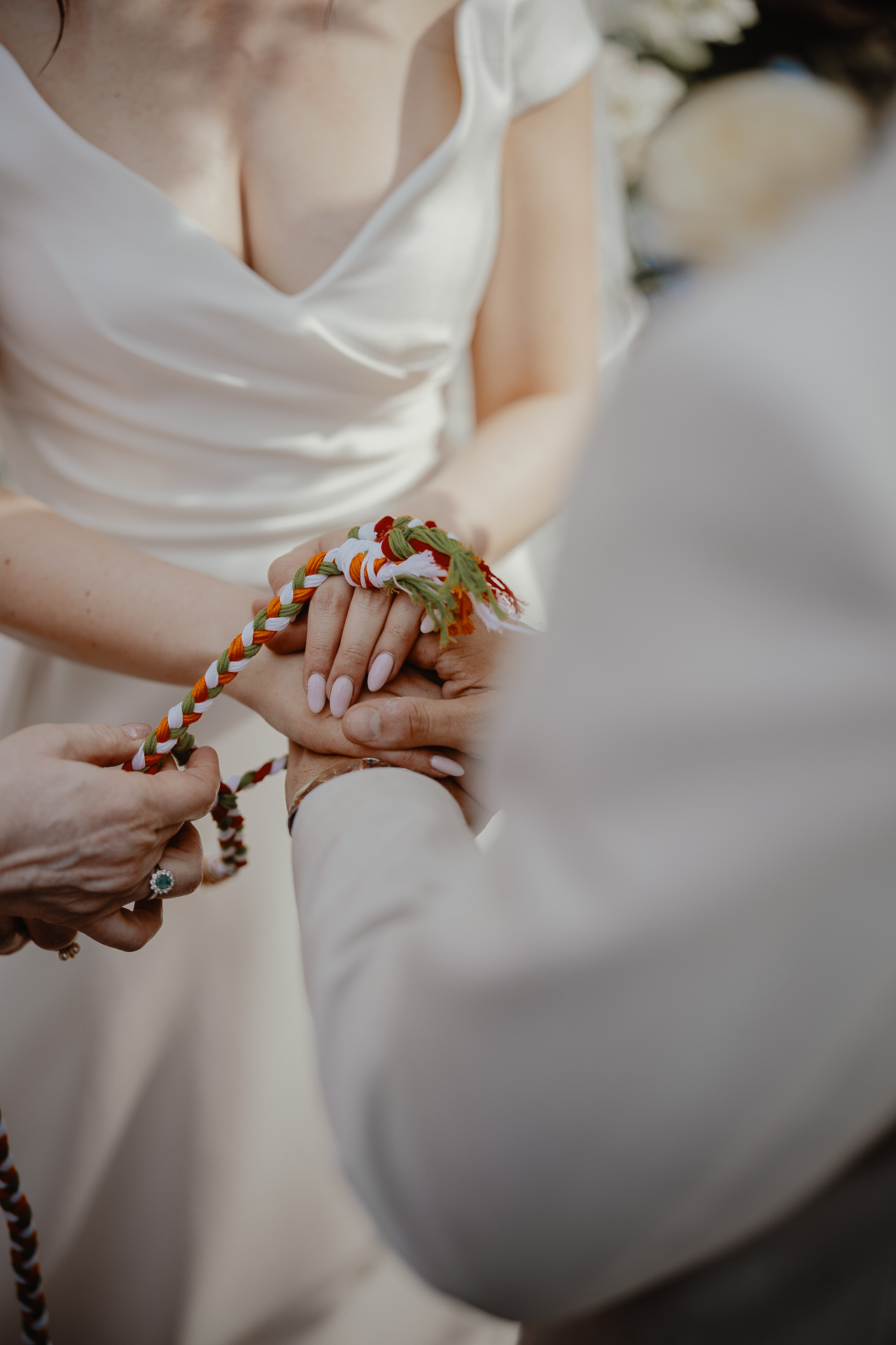 Their ceremony was truly special, featuring the ancient Handfasting ritual, a meaningful Celtic tradition. With their hands intertwined in the shape of infinity, they were bound together by colorful ribbons, each representing a wish and a virtue for their life together. It was a powerful and intimate moment, rich in symbolism and emotion.