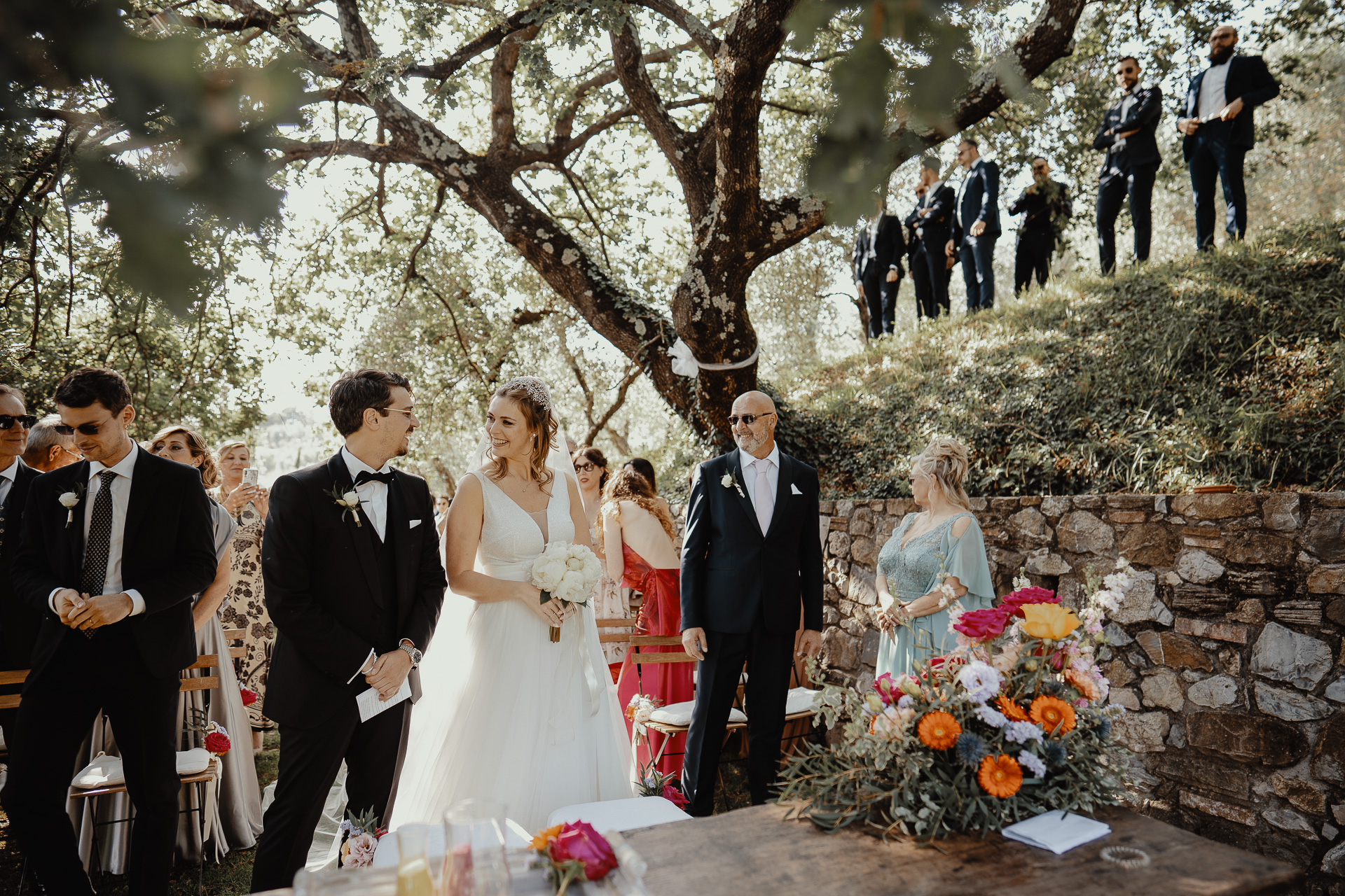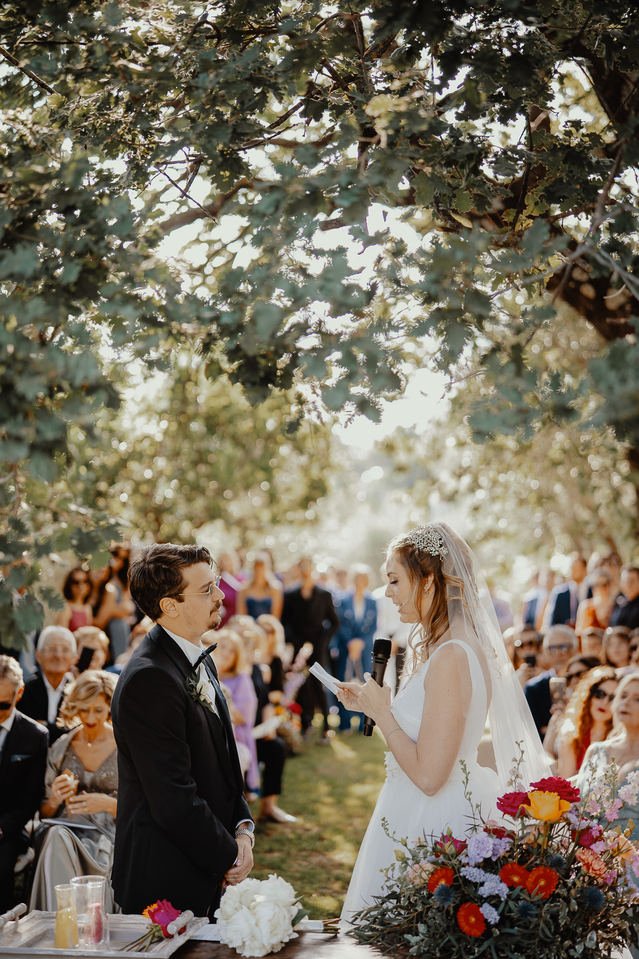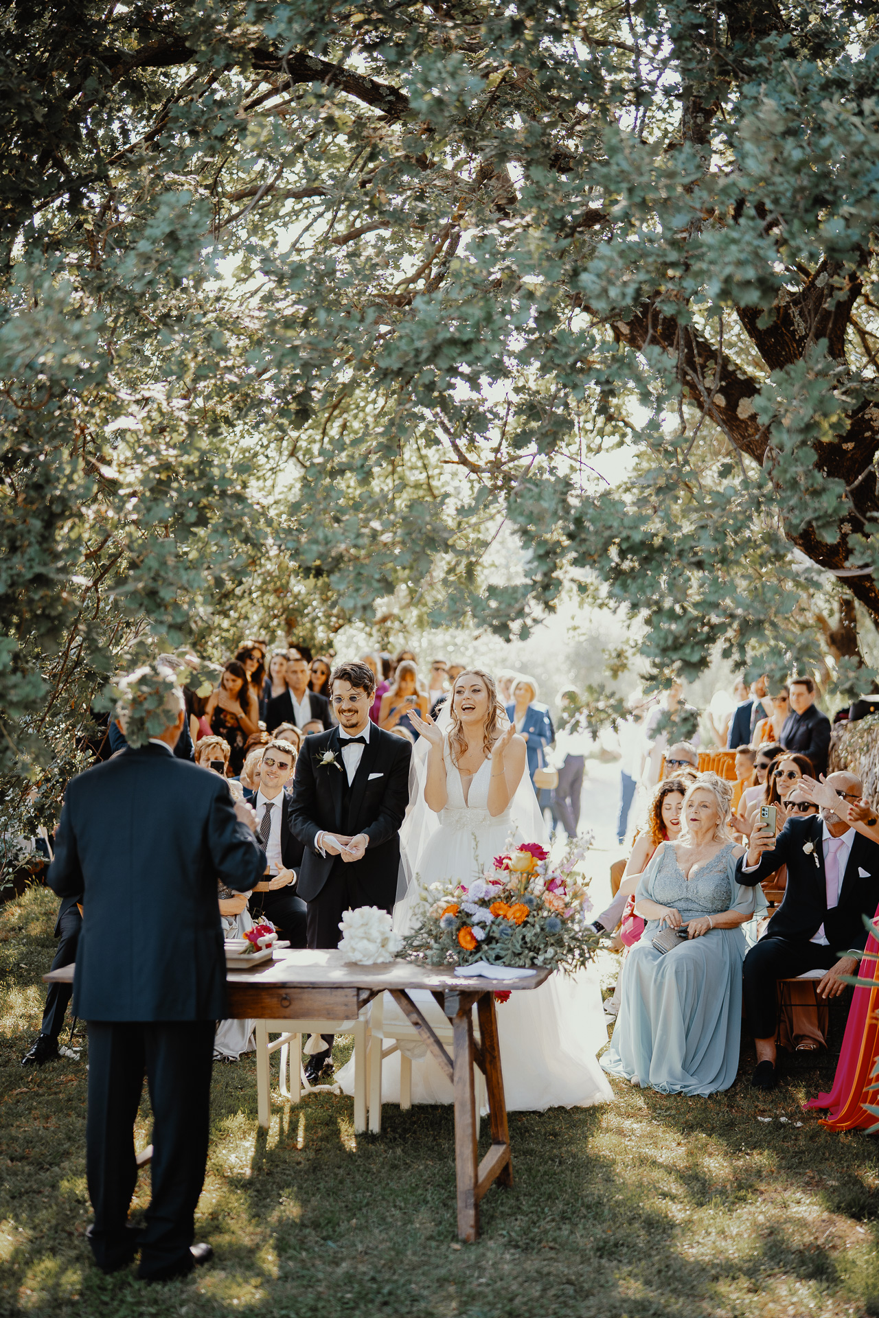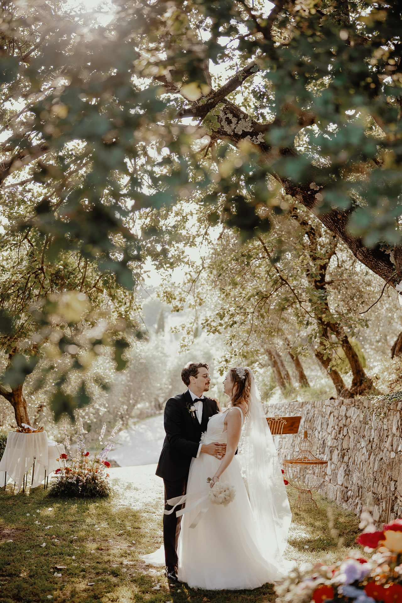 The ceremony took place in a small grove, a peaceful and romantic corner where the couple exchanged vows surrounded by nature and the people they love most. Their sweetness and connection could be felt in every glance and gesture.