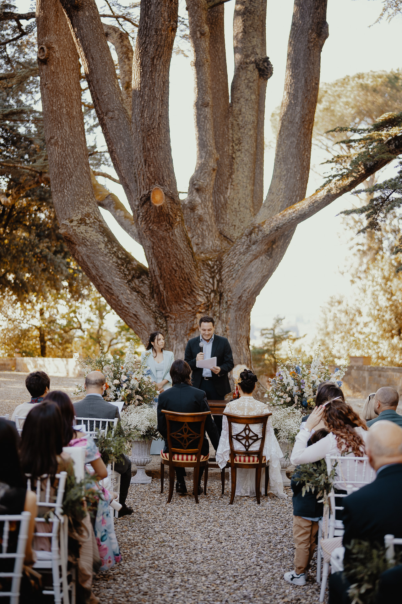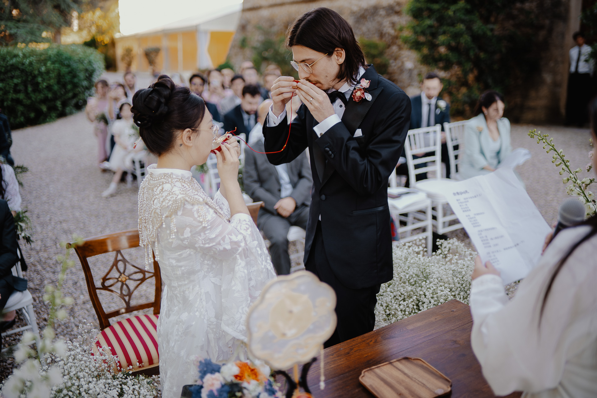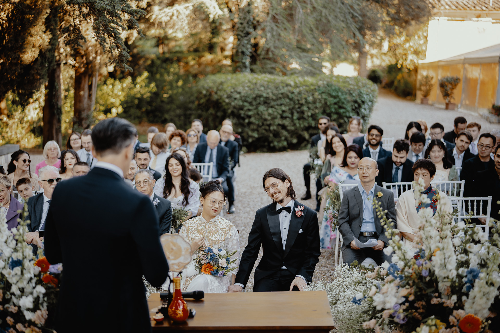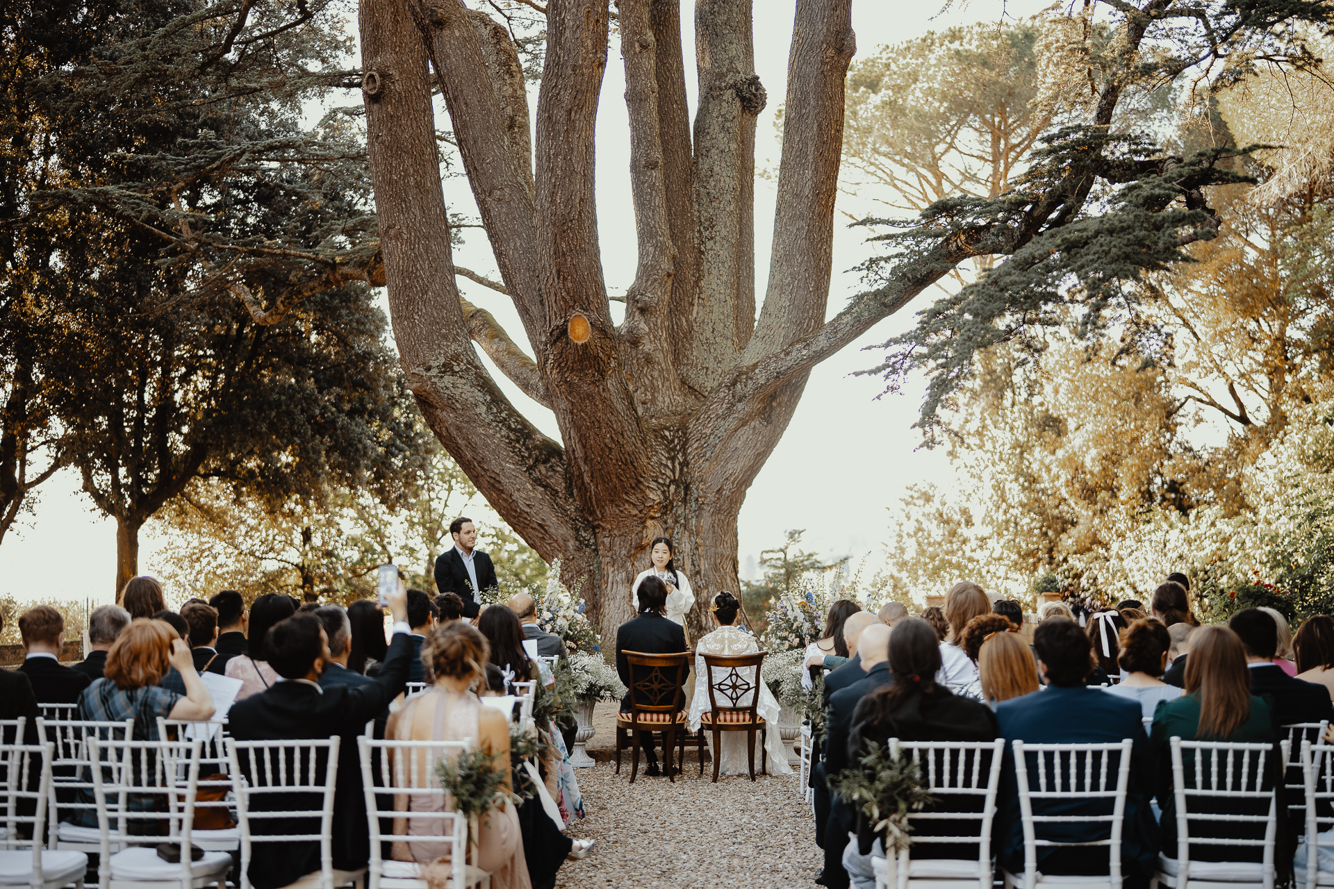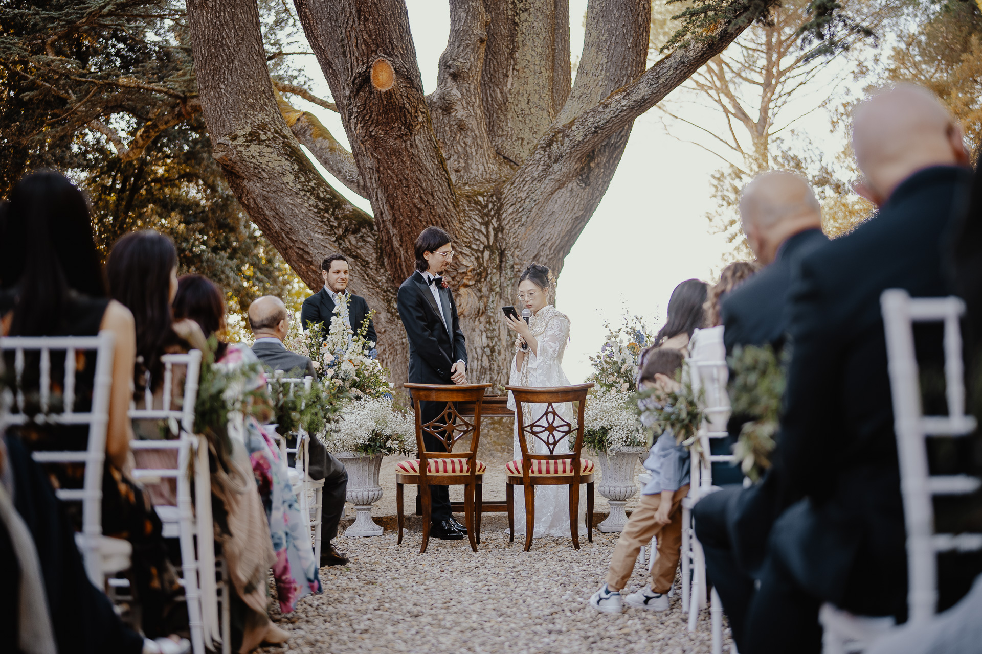 Ting, originally from China, and Lorenzo, an Italian living in London, brought together two cultures in the most elegant and heartfelt way. The ceremony took place beneath a breathtaking centuries-old tree — a natural cathedral filled with light and meaning. One of the most touching moments was the traditional tea ceremony, a beautiful homage to Ting’s heritage, shared in front of their closest loved ones.