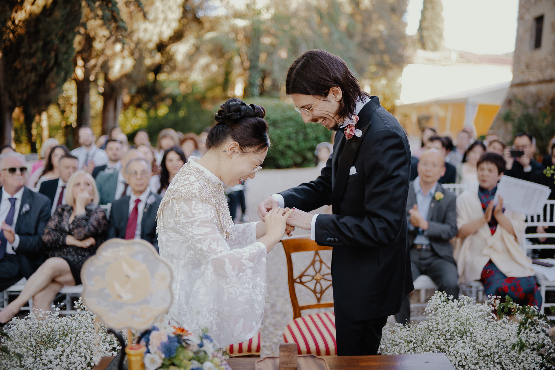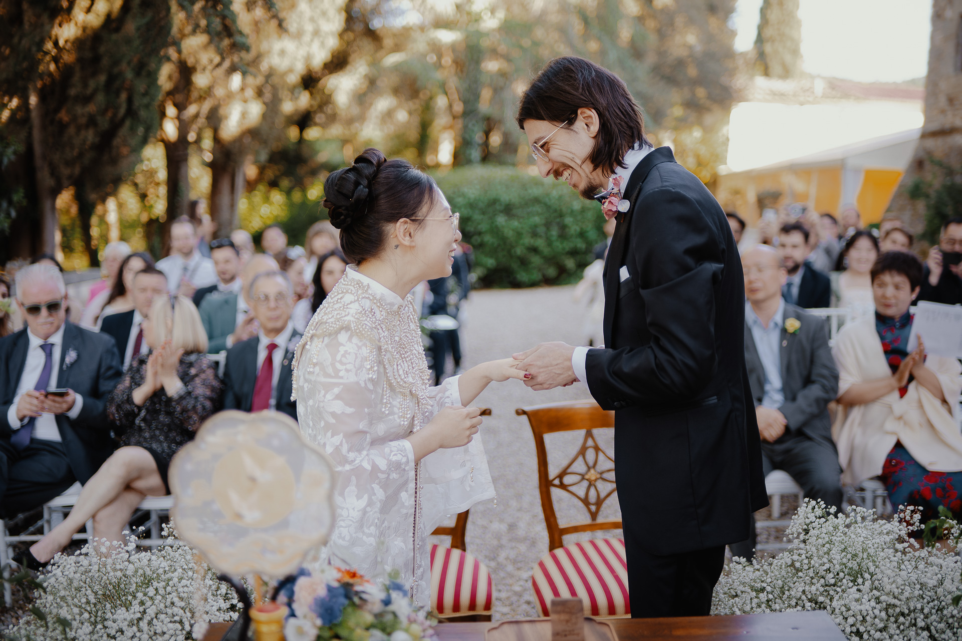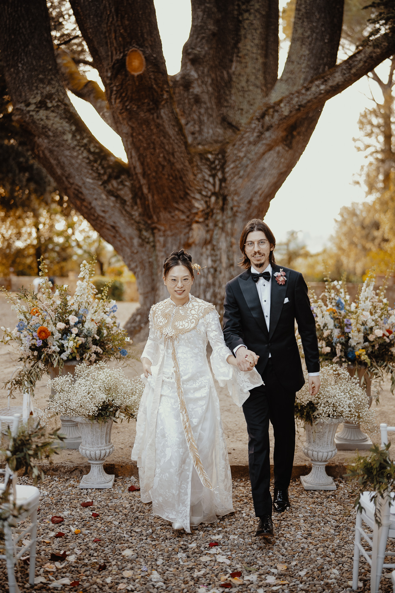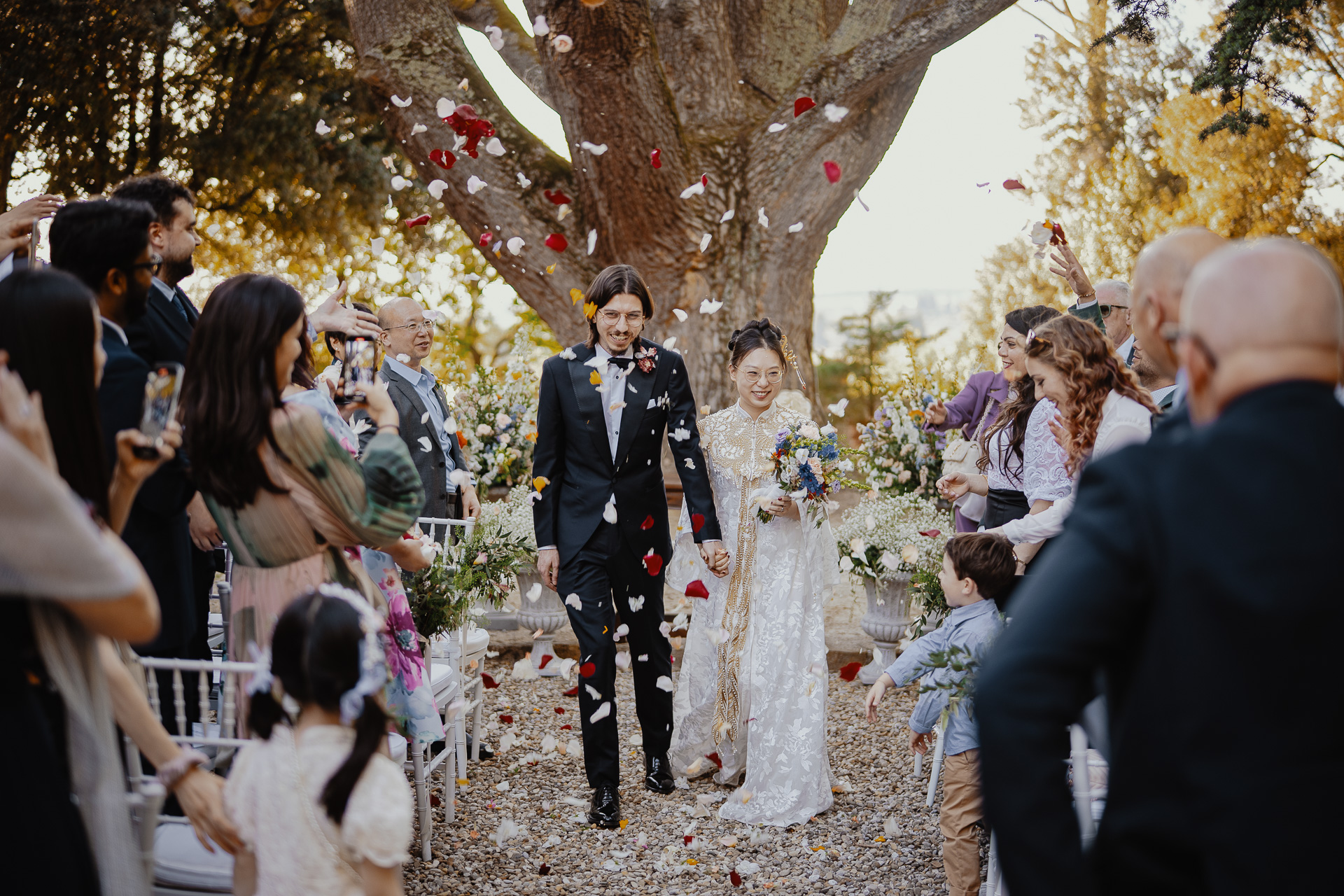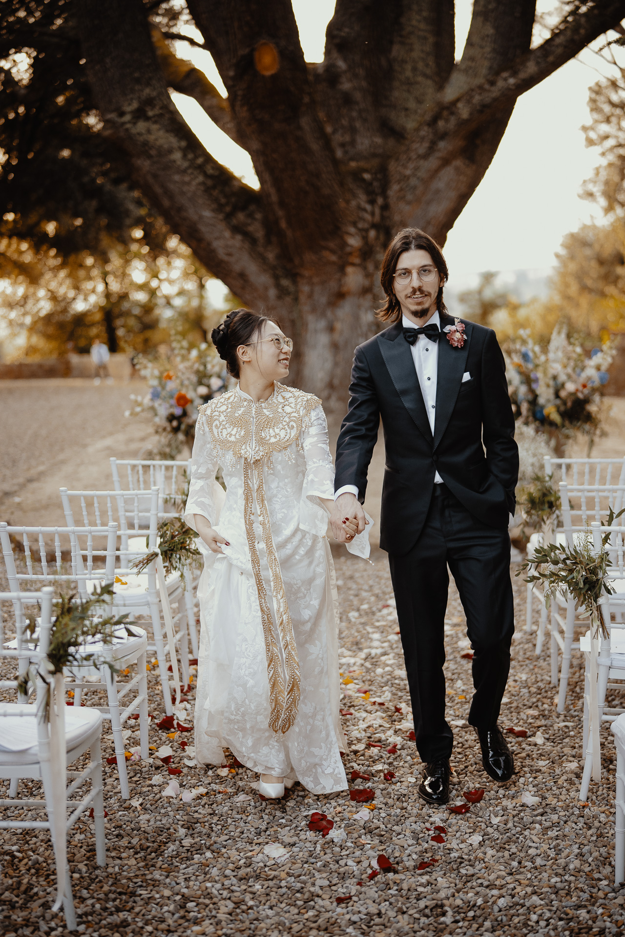 Ting, originally from China, and Lorenzo, an Italian living in London, brought together two cultures in the most elegant and heartfelt way. The ceremony took place beneath a breathtaking centuries-old tree — a natural cathedral filled with light and meaning. One of the most touching moments was the traditional tea ceremony, a beautiful homage to Ting’s heritage, shared in front of their closest loved ones.