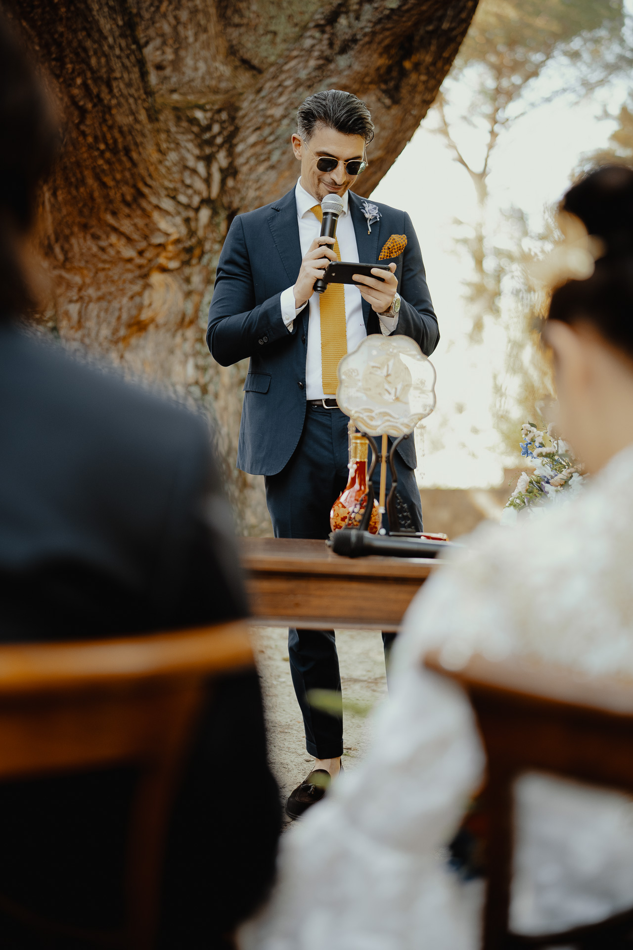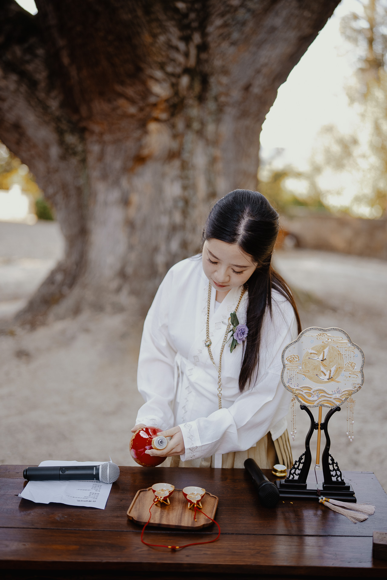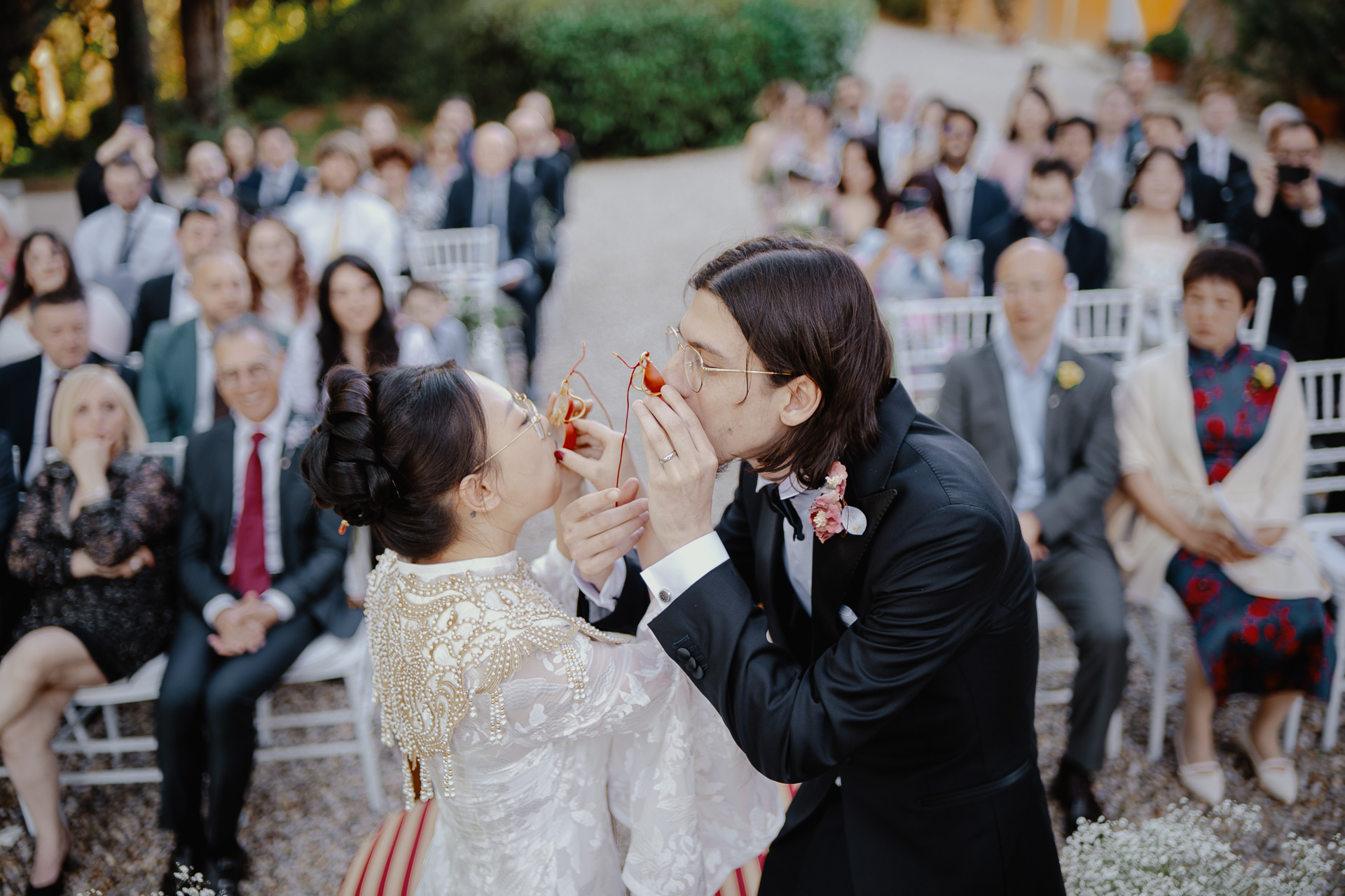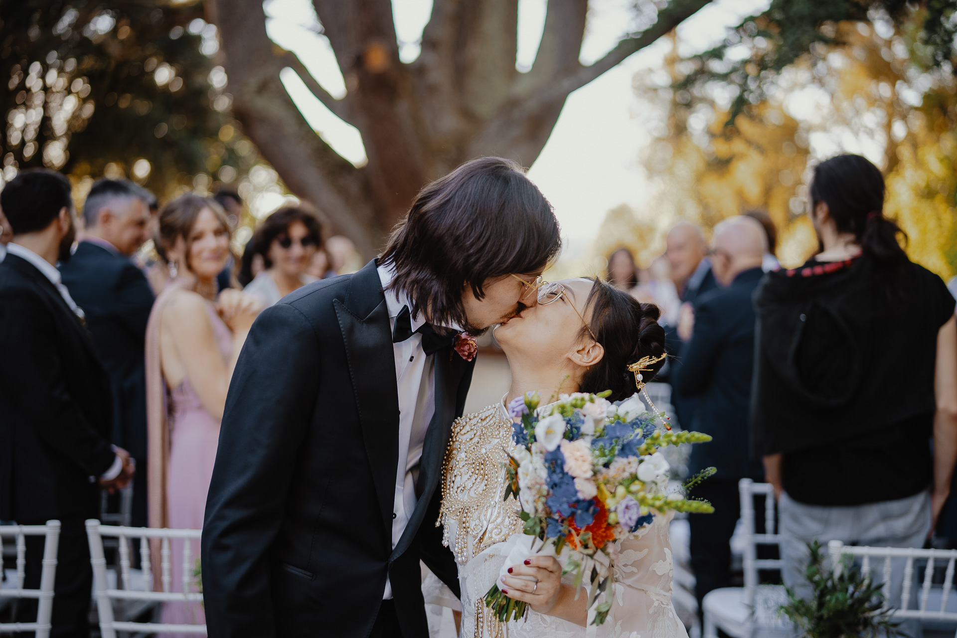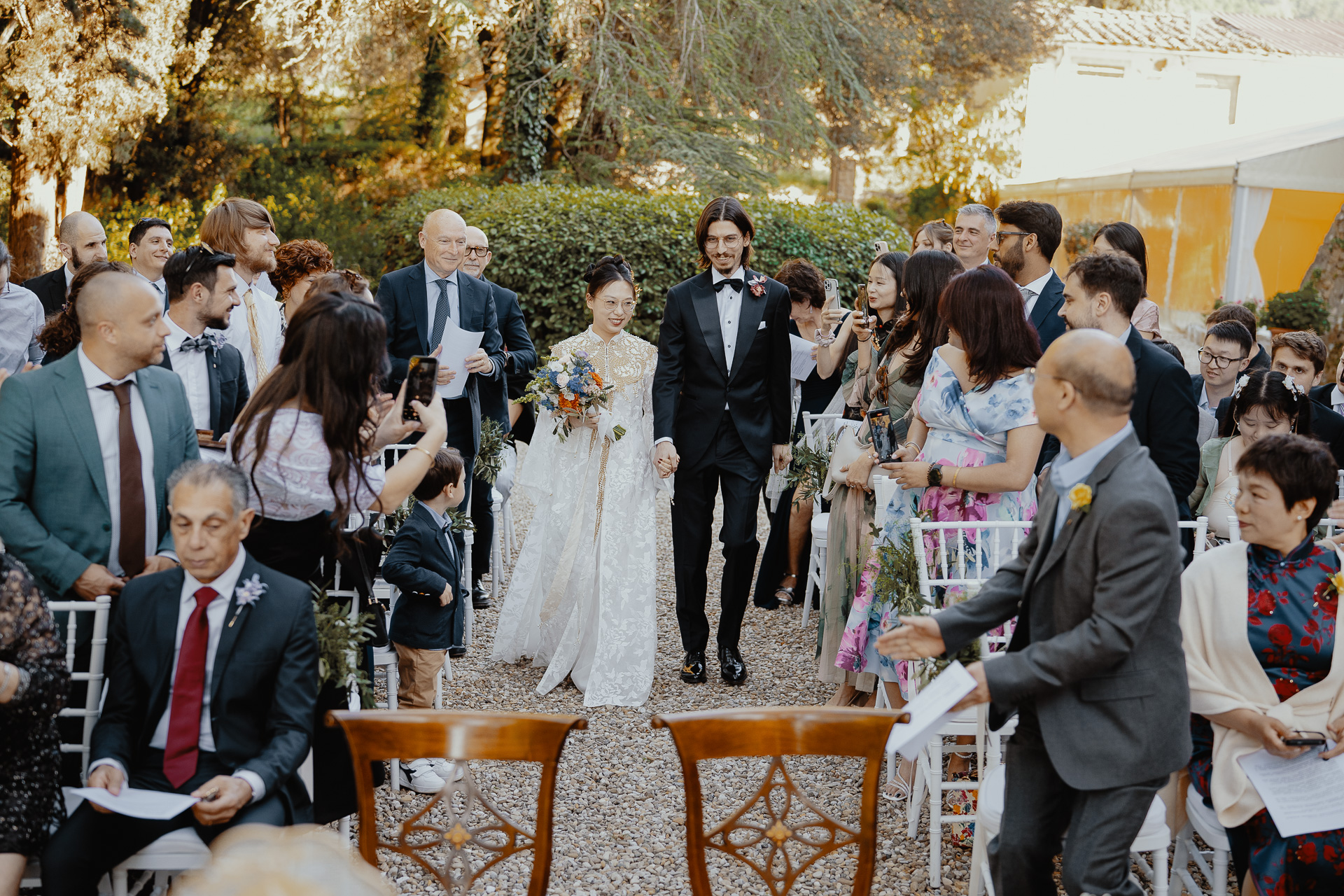 Ting, originally from China, and Lorenzo, an Italian living in London, brought together two cultures in the most elegant and heartfelt way. The ceremony took place beneath a breathtaking centuries-old tree — a natural cathedral filled with light and meaning. One of the most touching moments was the traditional tea ceremony, a beautiful homage to Ting’s heritage, shared in front of their closest loved ones.